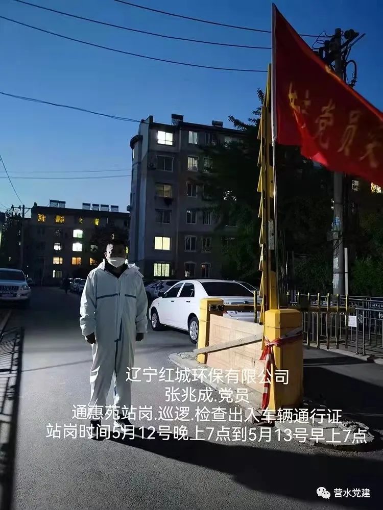 遼寧洪城環(huán)保有限公司黨支部張兆成負(fù)責(zé)通惠苑南門夜間站崗執(zhí)勤,每天工作10多個(gè)小時(shí)。5月14號(hào)早上,他站崗執(zhí)勤結(jié)束剛回到家中,便接到社區(qū)電話,需要挨家挨戶給居民送核酸檢測(cè)盒,他顧不上休息,立即穿上防護(hù)服沖進(jìn)一線,從每一個(gè)單元一樓開始敲門一直敲到6樓,發(fā)放結(jié)束后他已是滿身汗水,腰酸腿疼,坐在地下休息半天才起來。其實(shí)他家中有兩個(gè)年幼的孩子,尤其是老二還不滿兩周歲,正需要人照看,他把兩個(gè)孩子都留給妻子一人照顧,舍小家為大家,用大愛和奉獻(xiàn),譜寫了一曲動(dòng)人的抗疫贊歌。