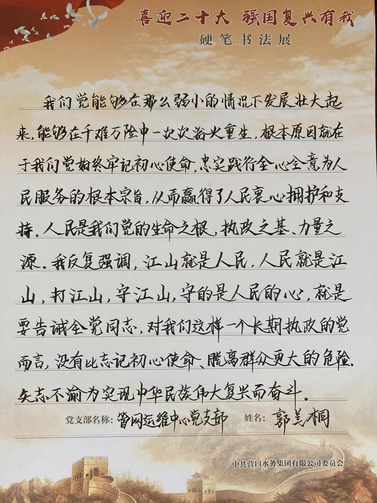 為深入學習貫徹習近平新時代中國特色社會主義思想,結合“強國復興有我”群眾性主題宣傳活動,水務集團組織開展“喜迎二十大 強國復興有我”硬筆書法展。